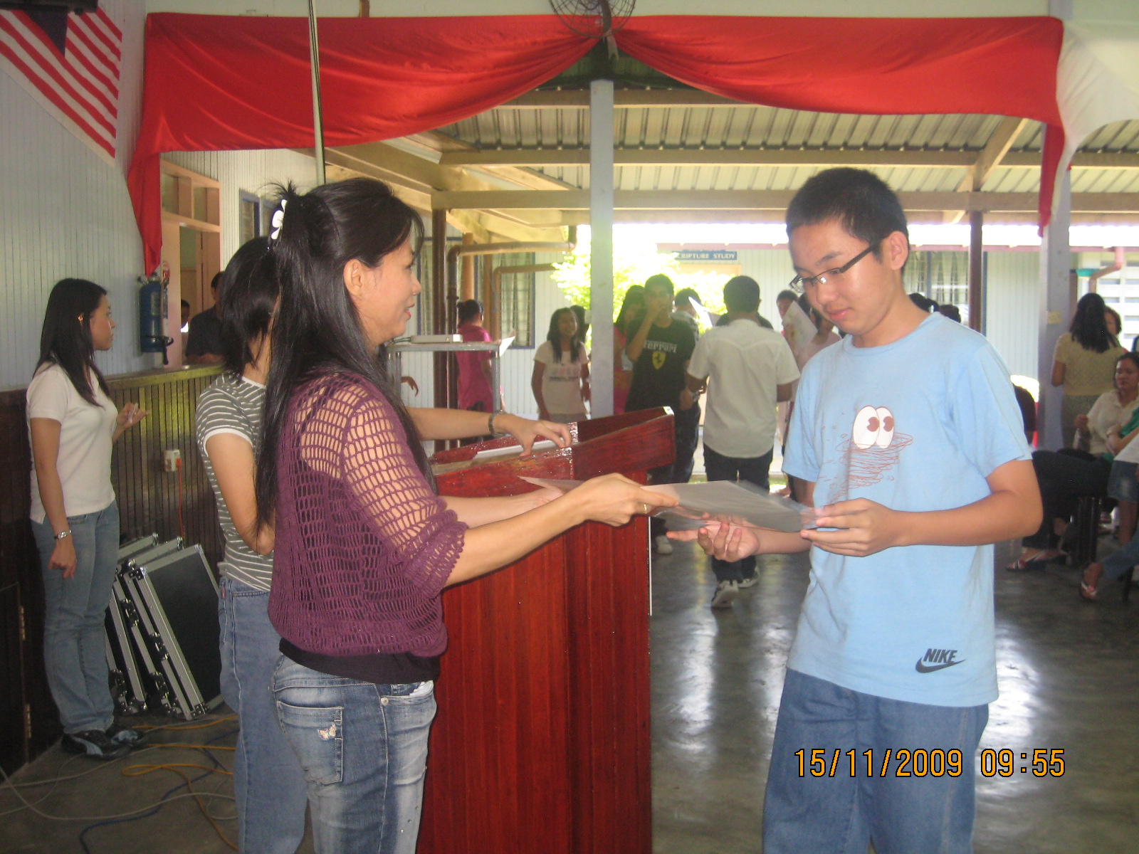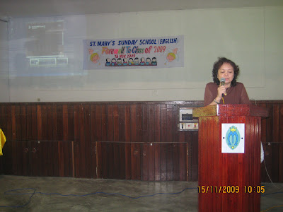 SUNDAY SCHOOL CLOSES FOR THE YEAR 2009 by Admin | Nov 16, 2009 | Uncategorized Chairperson Mary Lee during the closing Animators and some of the kids photo session Commended Isak Thomas & his wife Myrene Gidong Family with four kids attending sunday schools all won perfect attendance record! Receiving their confirmation certificate