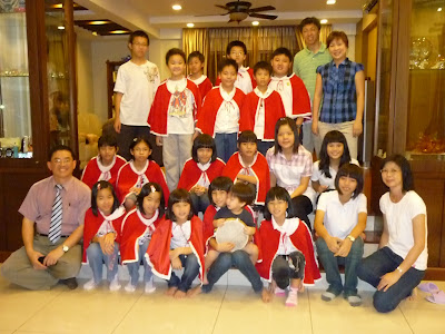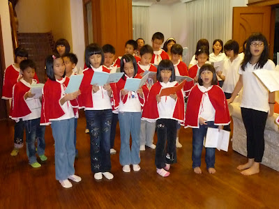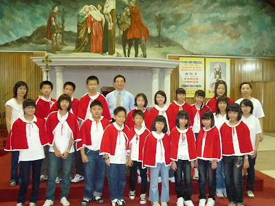 一群主日学的小孩子穿着红袍为教友传報喜讯.