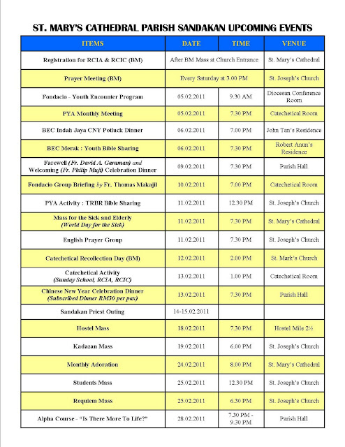 ST. MARY’S CATHEDRAL PARISH SANDAKAN UPCOMING EVENTS by Admin | Feb 5, 2011 | ST. MARY'S CATHEDRAL SANDAKAN click to enlarge image