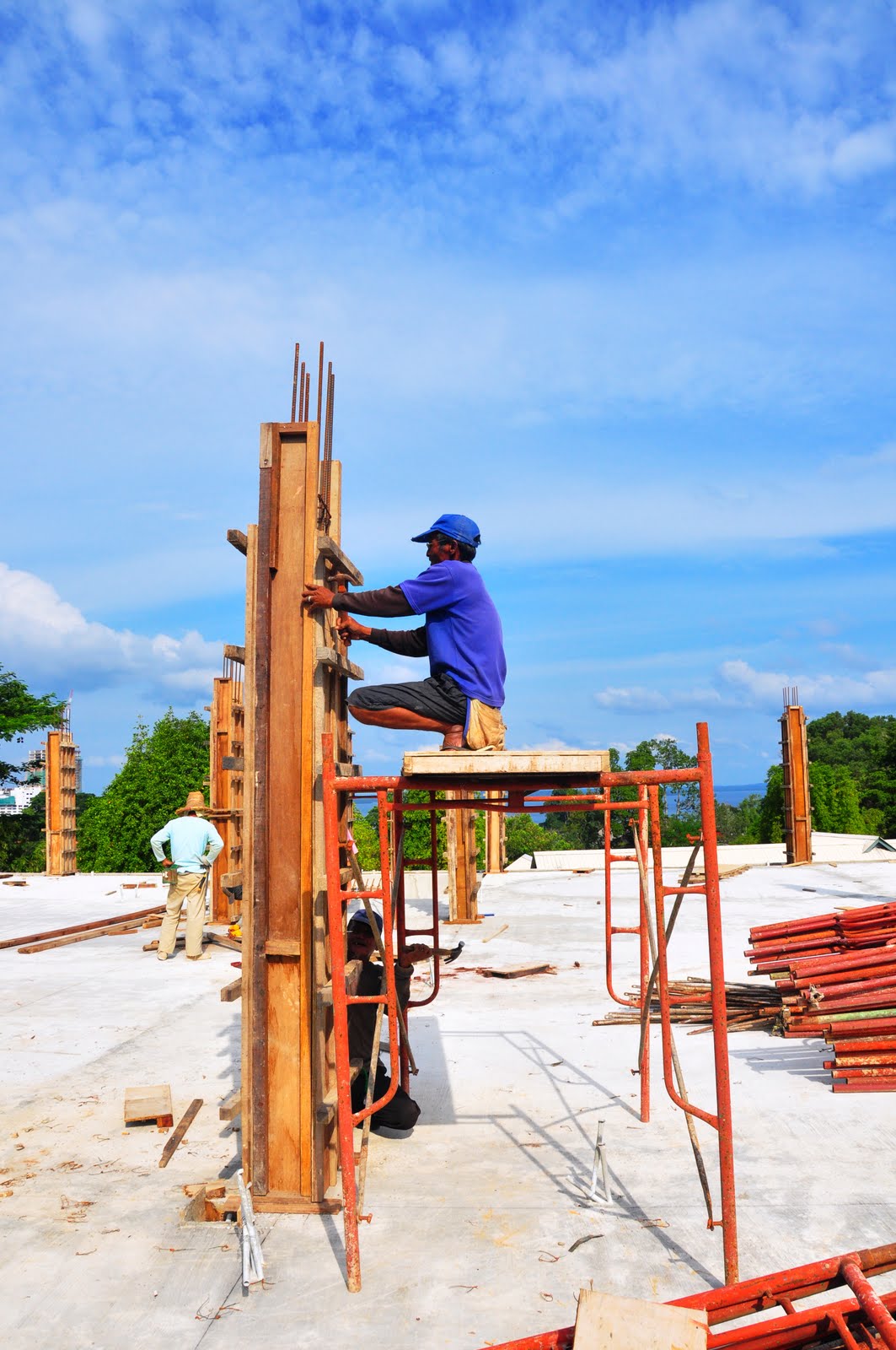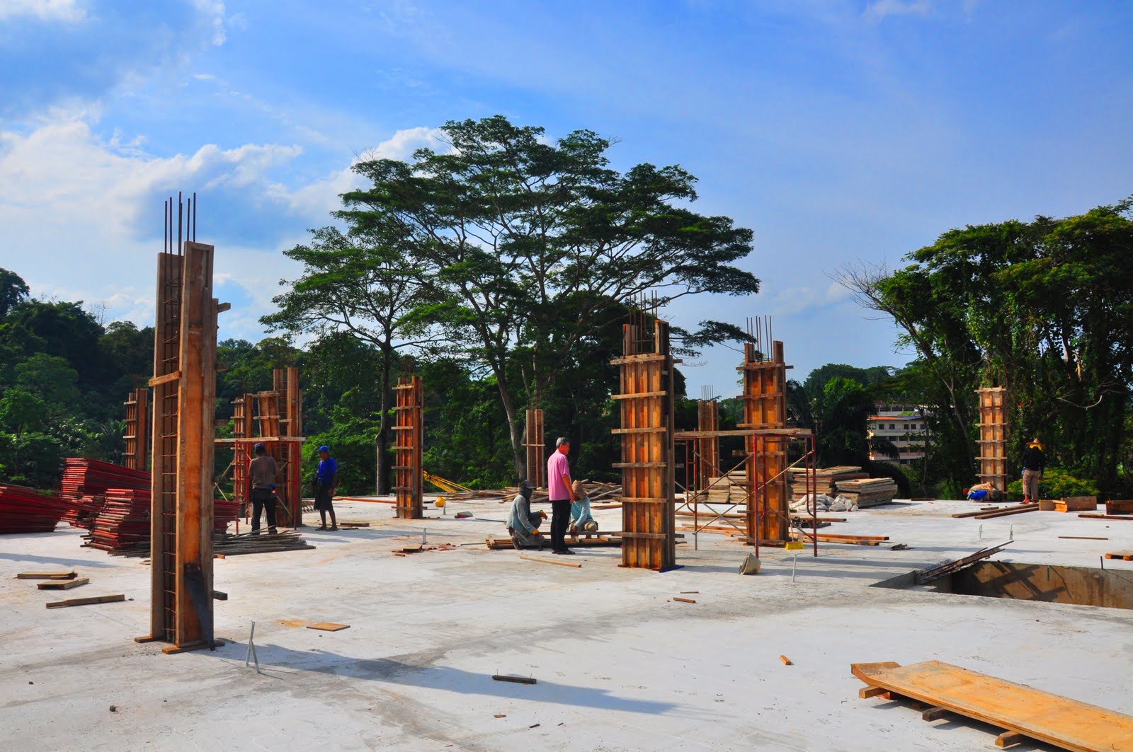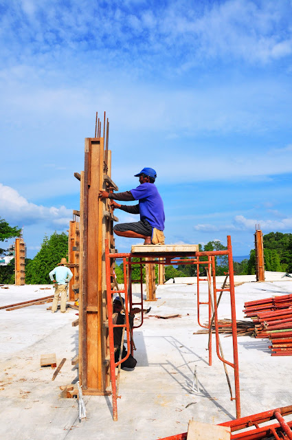 The floor slab for the 2nd floor has been concreted and the form work for the columns has been raised followed by form work for roof beams. Thereafter roof trusses will be assembled ready for the fixing of the roof top. At the meantime, work on brick laying at the ground floor has started.
