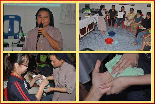 | Sr. Lilian FSIC mengkongkritkan hubungan sesama belia keuskupan dengan suatu upacara simbolik iaitu mencuci tangan rakan disamping kesempatan untuk perkongsian bakat-bakat dan memberi penghargaan serta ucapan terimkasih atas segala pelayanan. |