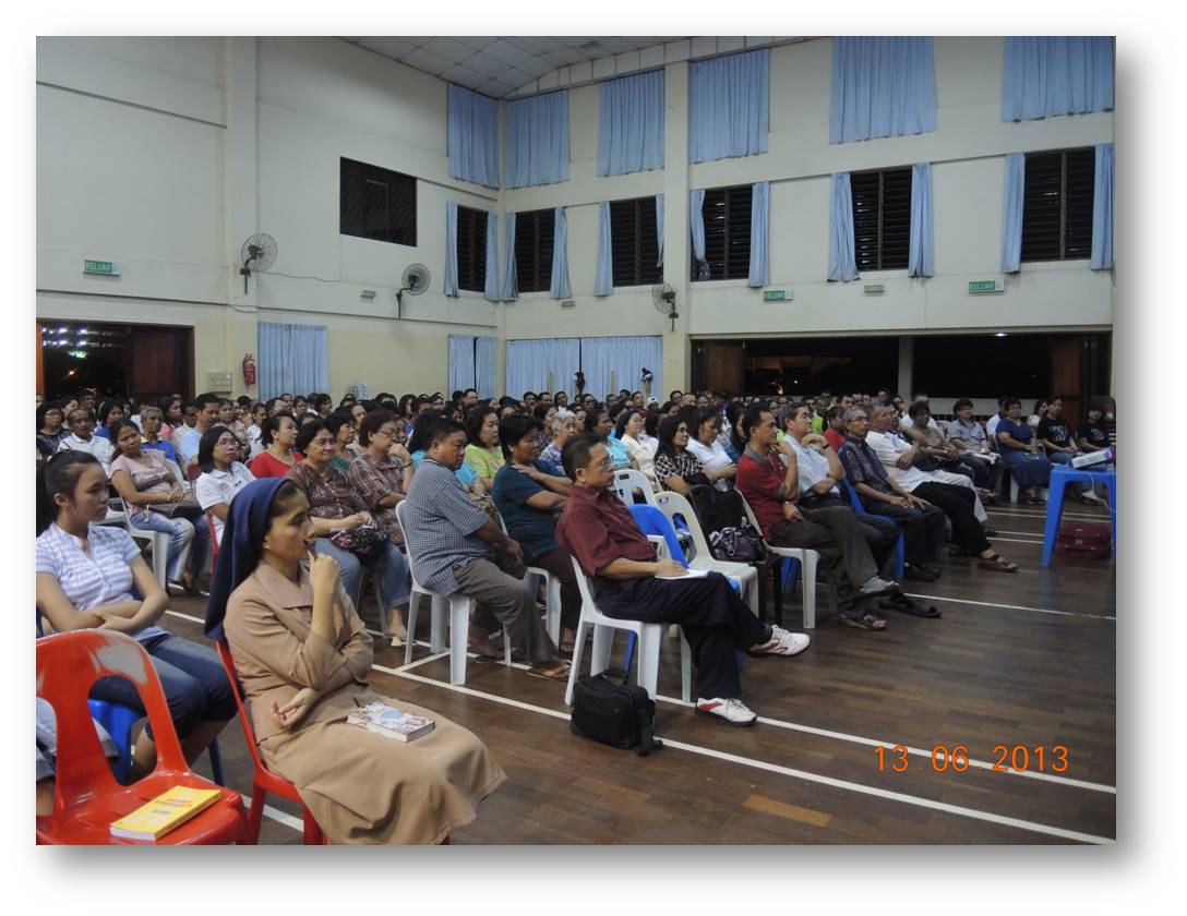 Tawau : Pada 13hb Jun 2013, ceramah yang sama yang disampaikan oleh Fr Lukas Jua, telah berlangsung di Dewan Paroki Holy Trinity dari pukul 7.30 malam hingga 9.45 malam. Lebih dari 400 umat mewakili pelbagai komuniti termasuk KKD dan stasiluar hadir ke ceramah tersebut. Turut hadir bersama ialah Msgr Nicholas Ong, para religius dan Sdra Mario, pengerusi MPP. Satu slot singkat soal jawab diadakan sebaik selesai sesi input.