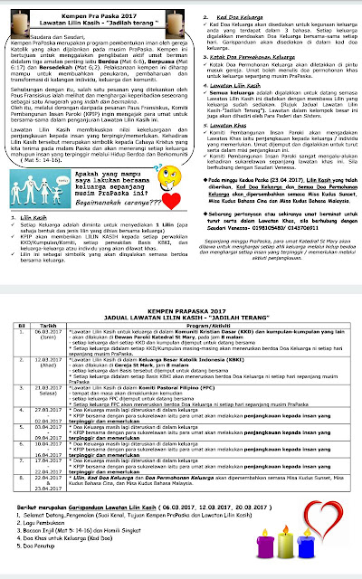 Pada minggu kedua Paska iaitu pada 23hb April 2017 nanti, Lilin Kasih yang telah diberikan, Kad Doa Keluarga dan semua Doa Permohonan Keluarga akan dipersembahkan semasa Misa Kudus Senja, Misa Kudus Bahasa Cina dan Misa Kudus Bahasa Malaysia. Lawatan Lilin Kasih ini akan berjalan sepanjang Musim Prapaska 2017.