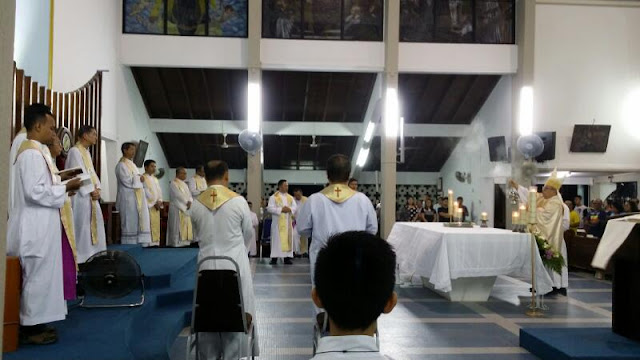 Sandakan: The Chrism Mass was celebrated earlier at the St. Mary Cathedral on April 7 due to pastoral convenience. The Mass began with the entrance procession whilst the entire congregation sang the hymn Priestly People. More than 800 parishioners attended the Mass which was presided over by Bishop Julius Dusin Gitom and together with 9 Sandakan Diocesan Priests and 3 Indonesian visiting Priests concelebrating with him.