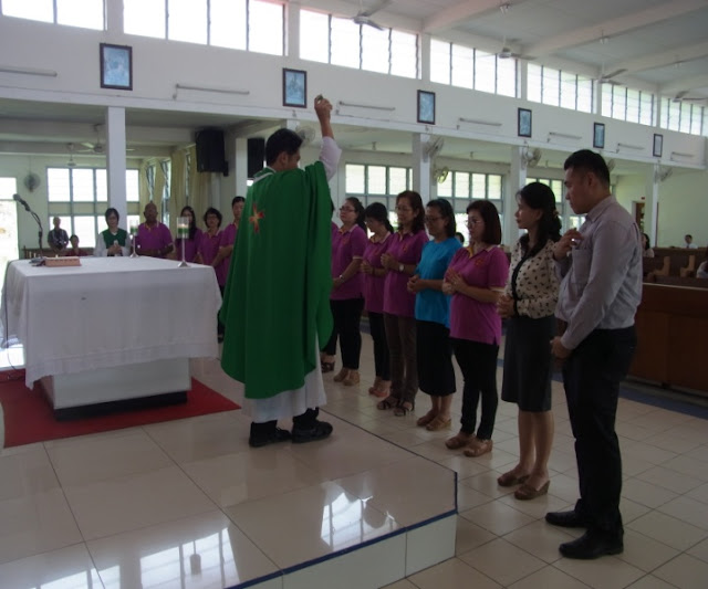 Fr. Christopher began his homily by saying that the Eucharistic celebration is not only to celebrate Teachers’ Day but also to celebrate being a teacher as a vocation. Teaching is a noble vocation and by treating this job as a vocation, teachers are able to bring Christ in their career. He also encouraged teachers not to give up easily despite facing all sorts of pressures and obstacles. He thanked all teachers for their great efforts. He also acknowledged the efforts done by his former teachers at SMK Sandakan. During the celebration, Fr. Christopher blessed the new line up for Sandakan CTG.