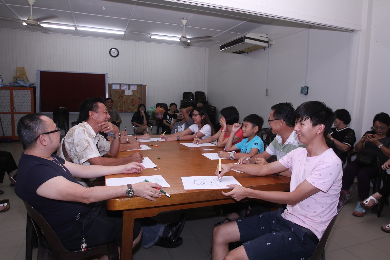 交流会的节目有“煲乐”聚餐,歌唱赞美和游戏。所有的环节都是以“交流,沟通”为目的。大家各自携带佳肴美食,共享同欢,共融在主的慈爱中。游戏的主题为“沟通”,分两个部分; 第一部分是慕道者和他们的代父母面对面坐着,以语言,以绘图进行交流。第二部分要在静默中进行,参加者被规定不能说话,一组人一起完成一项手工作业。大家要以眼神,以肢体语言来进行交流。虽然没有语言的交流,大家也能达到沟通的效果,顺利地完成作业。这特意的安排是为了让大家体验不同方式的“沟通”,也让大家明白沟通的不同层面。只要愿意努力,就会有所收获。