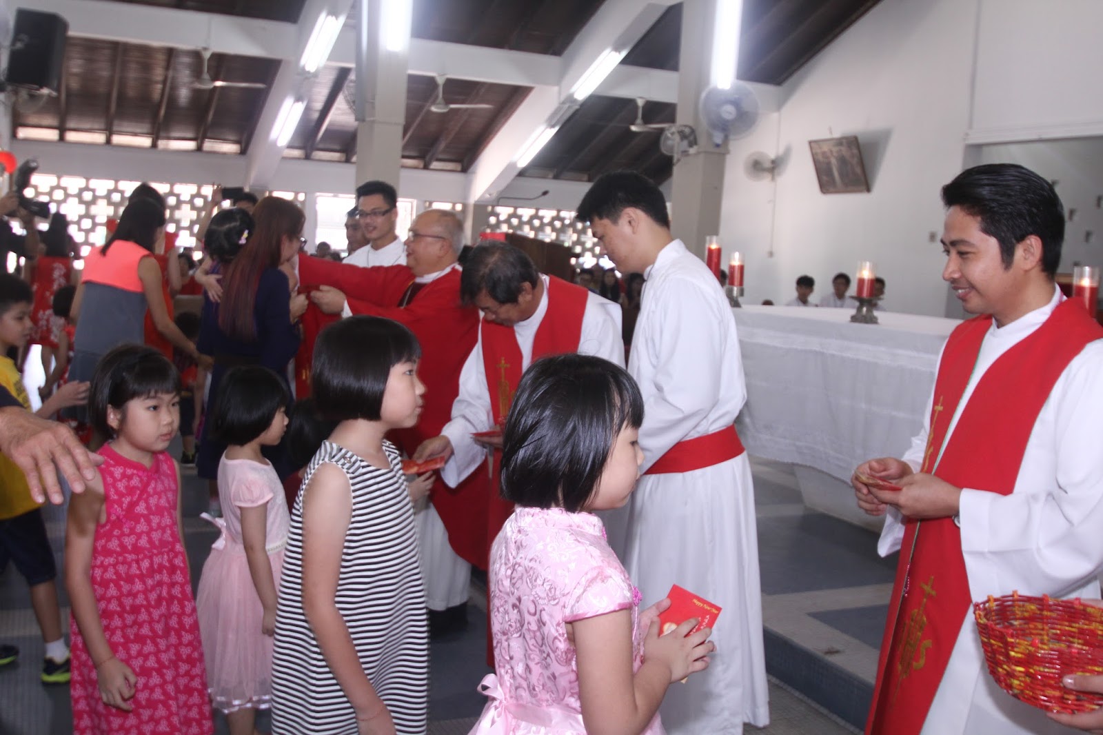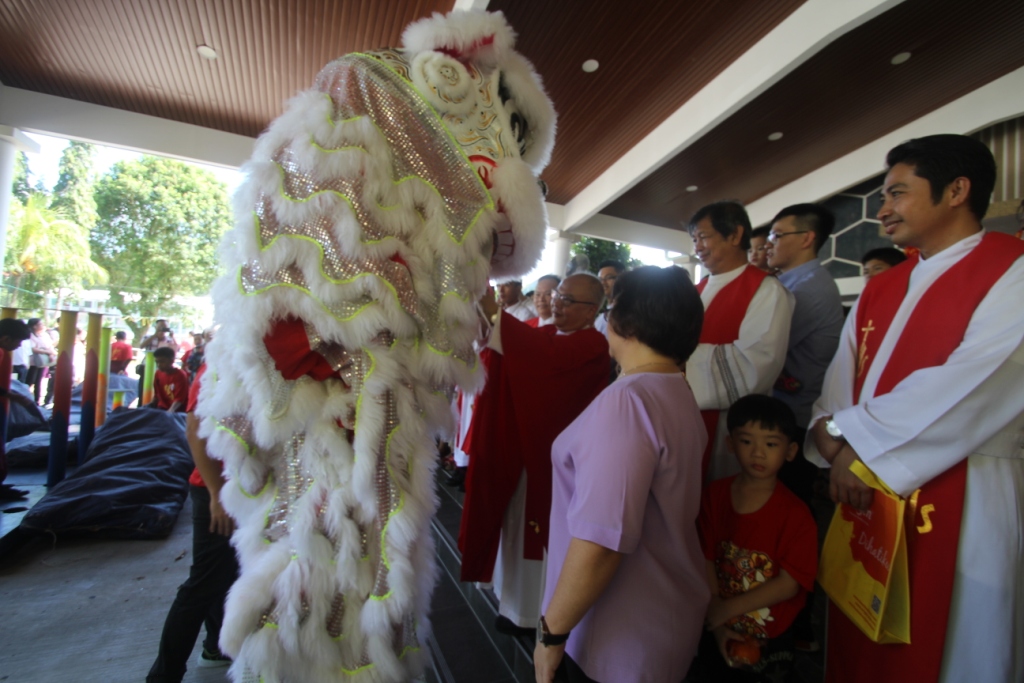弥撒后有精武醒狮团舞狮助兴。主教、神父、修女、教友们齐聚圣堂门口观赏精彩的舞狮表演。过后,教友一一向主教、神父、修女们拜年,并赠红包致意。同时,教友们也彼此祝贺。