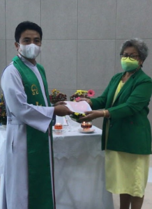 Pemberian cenderahati kepada Bapa Uskup Julius, Fr. Christopher, Sr. Regina Kimung FSIC dan pemain gitar (untuk misa kudus)