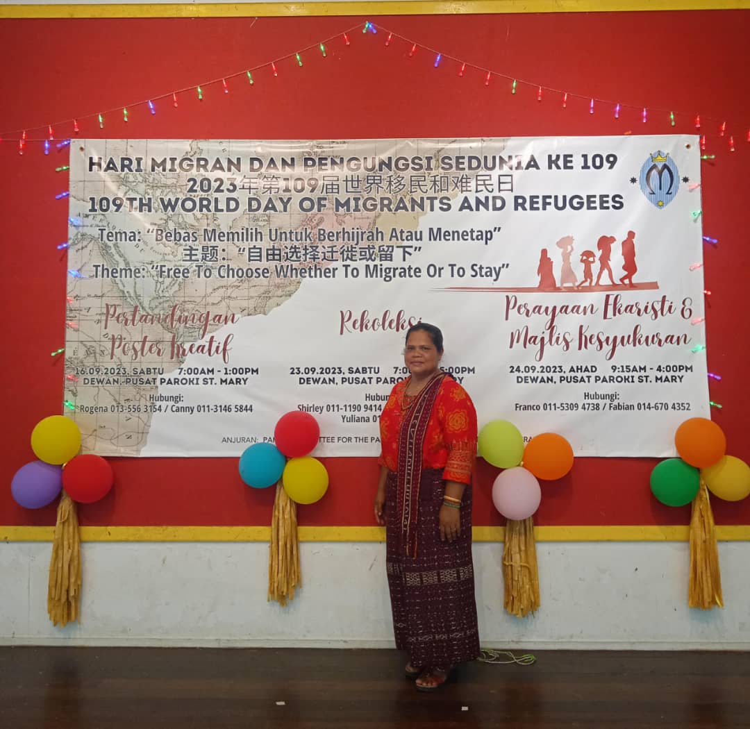 Ini adalah sedikit perkongsian saya mengenai tema Hari Migran dan Pengungsi Sedunia yang ke-109 untuk tahun 2023, “Bebas Memilih untuk Berhijrah atau Menetap.” Saya amat tersentuh dengan tema pada kali ini kerana terlalu banyak faktor penyebabnya berlakunya migrasi seperti ekonomi, bencana alam dan peperangan. Di sini, saya ingin berkongsi lebih kepada faktor ekonomi kerana inilah penyebab utama bagi saya dan keluarga berhijrah ke sini. Kami merantau ke sini demi memperbaiki keadaan ekonomi keluarga kami. Sebagai migran dan perantau, pasti ada cabaran yang dihadapi di tempat yang dituju. Tidak dapat dinafikan dan dielakkan sekiranya wujud prasangka daripada penduduk tempatan terhadap para migran dan perantau. Maka dengan itu, kita mestilah berusaha untuk menyesuaikan diri dengan masyarakat setempat dan mengenali sesama dengan secepat mungkin. Maka, dengan bantuan Tuhan melalui sesama, kita dapat lebih mengenali, saling memberi dan menerima. Seiring dengan penyesuaian itu, maka kita dapat mewujudkan komuniti yang berjalan bersama, melayani semua orang yang memerlukan, di samping itu juga kita dapat membangun iman dengan sesama kita iaitu beriman kepada Tuhan Yesus. Tuhan memberkati kita. Terima kasih.”