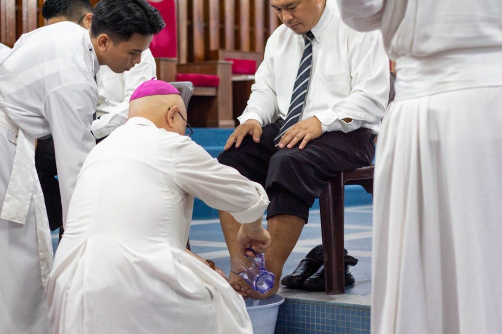 Maundy Thursday or Holy Thursday is the commemoration of the Last Supper of Jesus Christ, when he administered the sacrament of Holy Communion before his arrest and crucifixion. It is also an act of humility, as it is said during Holy Week, which commemorates the washing of the feet and the last supper of Jesus Christ with the apostles. More than 1,200 parishioners gathered for evening mass at St. Mary’s Cathedral in Sandakan on 27 March 2024. The mass was presided over by His Lordship Bishop Julius Dusin Gitom. On the same day, Maundy Thursday was celebrated at St. Joseph’s Church by Rev Fr Raymond Lee Seng Huat in Mandarin and St. Mark’s Church was celebrated in Bahasa by Rev Fr Simon Kontou.