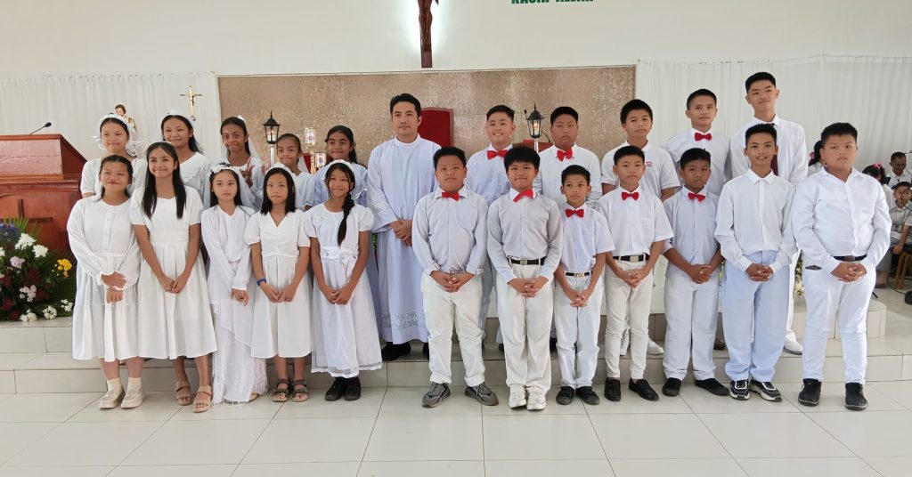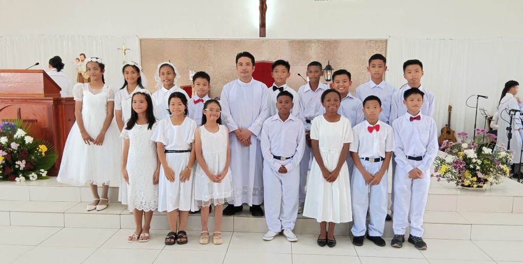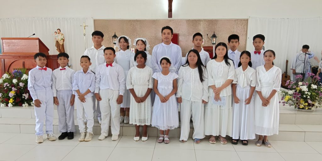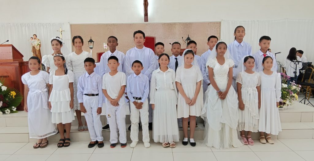 TELUPID – Dalam suasana penuh kesyukuran sempena Hari Minggu Tubuh dan Darah Kristus pada 22 Jun 2025, seramai 83 orang pelajar PMG dari seluruh paroki telah menerima Sakramen Ekaristi dalam satu perayaan Misa Kudus yang dirayakan oleh Rev. Fr. Christopher Ireneus, Paderi Paroki St. Martin Telupid.