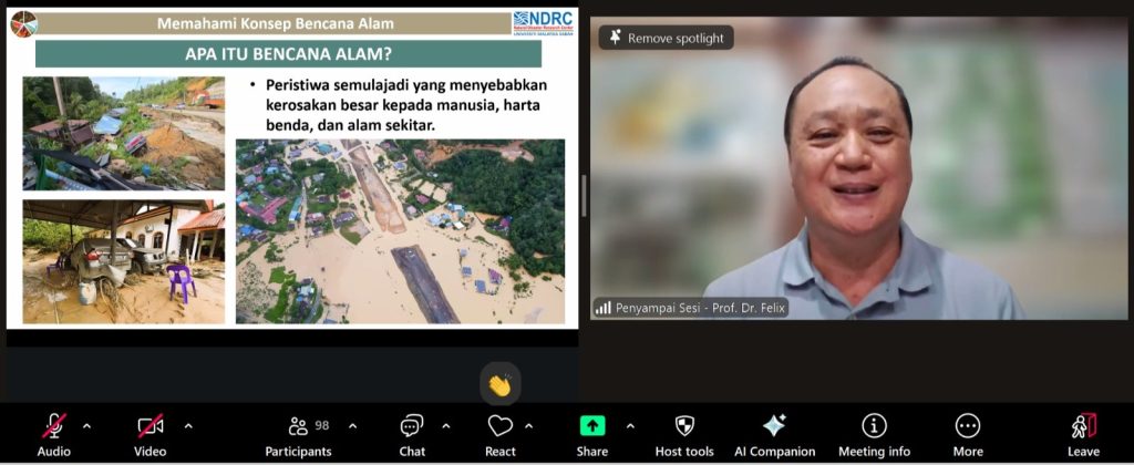 Profesor Dr. Felix juga berkongsi mengenai beberapa kejadian bencana yang telah dan sedang berlaku di Sabah, serta pengalaman peribadi beliau dalam menangani situasi-situasi tersebut. Beliau turut menekankan bahawa komuniti memainkan peranan penting dalam aspek kesiapsiagaan dan pengurangan risiko bencana.